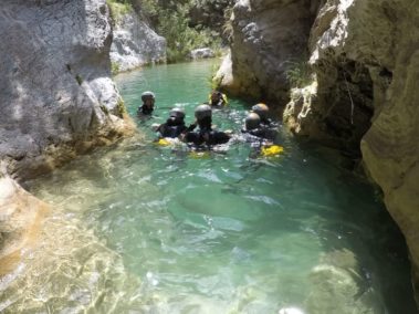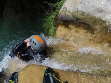 Half-day of guided canyoning route in Río Verde. This canyon, in the Tejeda y Almijara Mountain Range, natural border between Granada and Malaga, is one of the best places to practice the descent of canyons in Spain and one of the most fun routes that can be done in the south of the peninsula near to the famous village of Nerja.